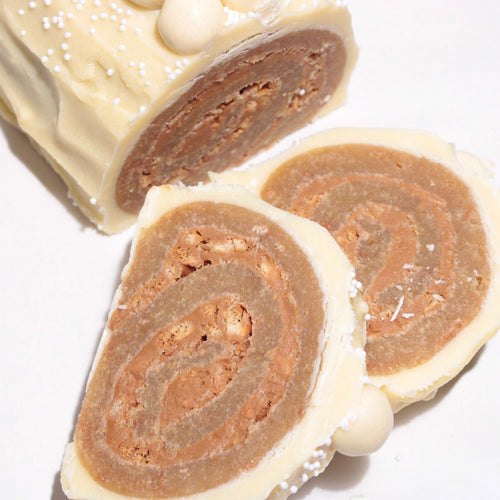 Option 2 - Delicious blondie rolled with biscoff spread and crushed butter biscuits encased in a milkybar butter ganache finished with white malteasers and a dusting of glitter.